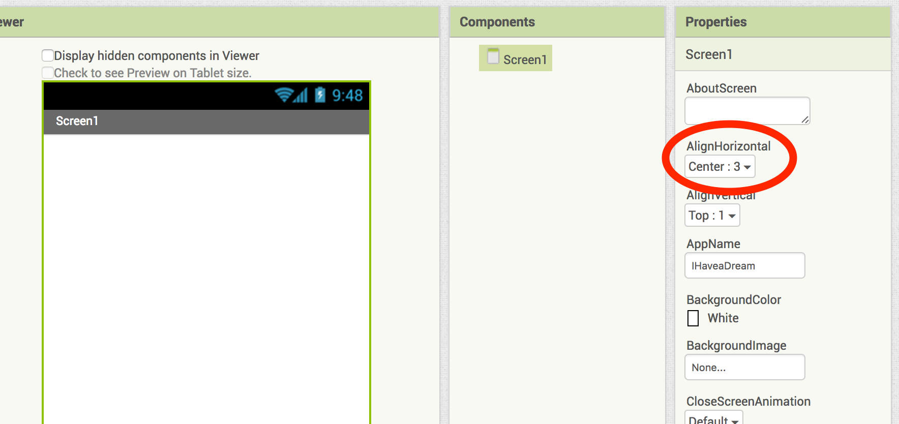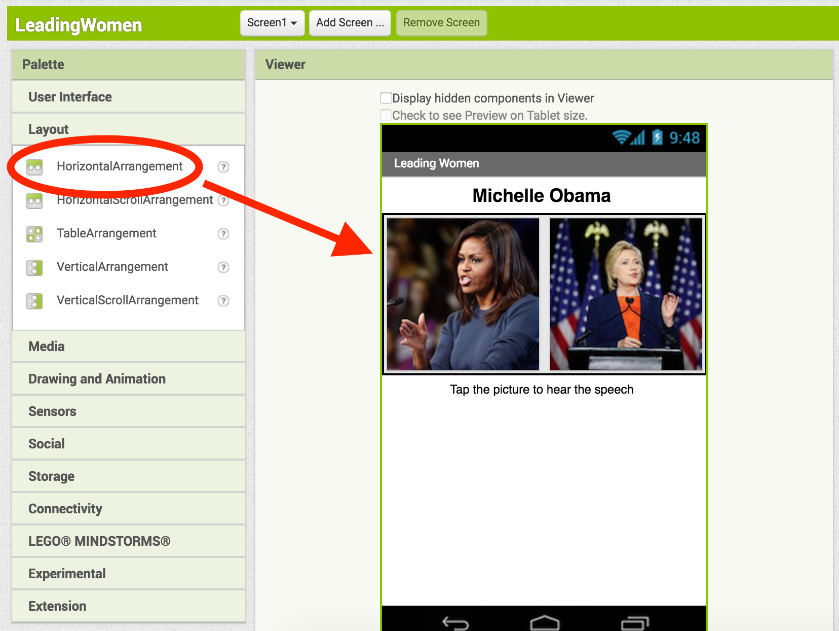 From the Layout drawer, drag a HorizontalArrangment into the workspace, and add the two buttons so that they appear side-by-side.