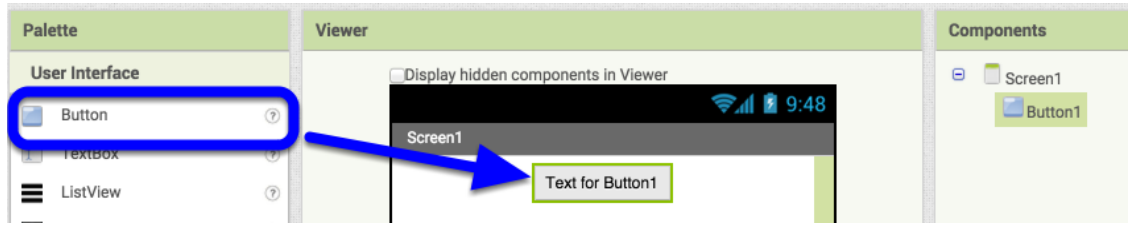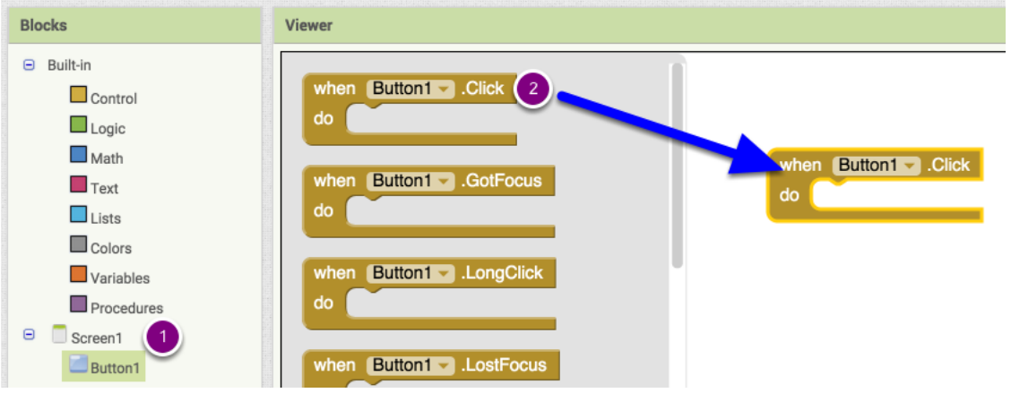 Go to Blocks View. Drag a when Button1.Click event handler into the workspace.