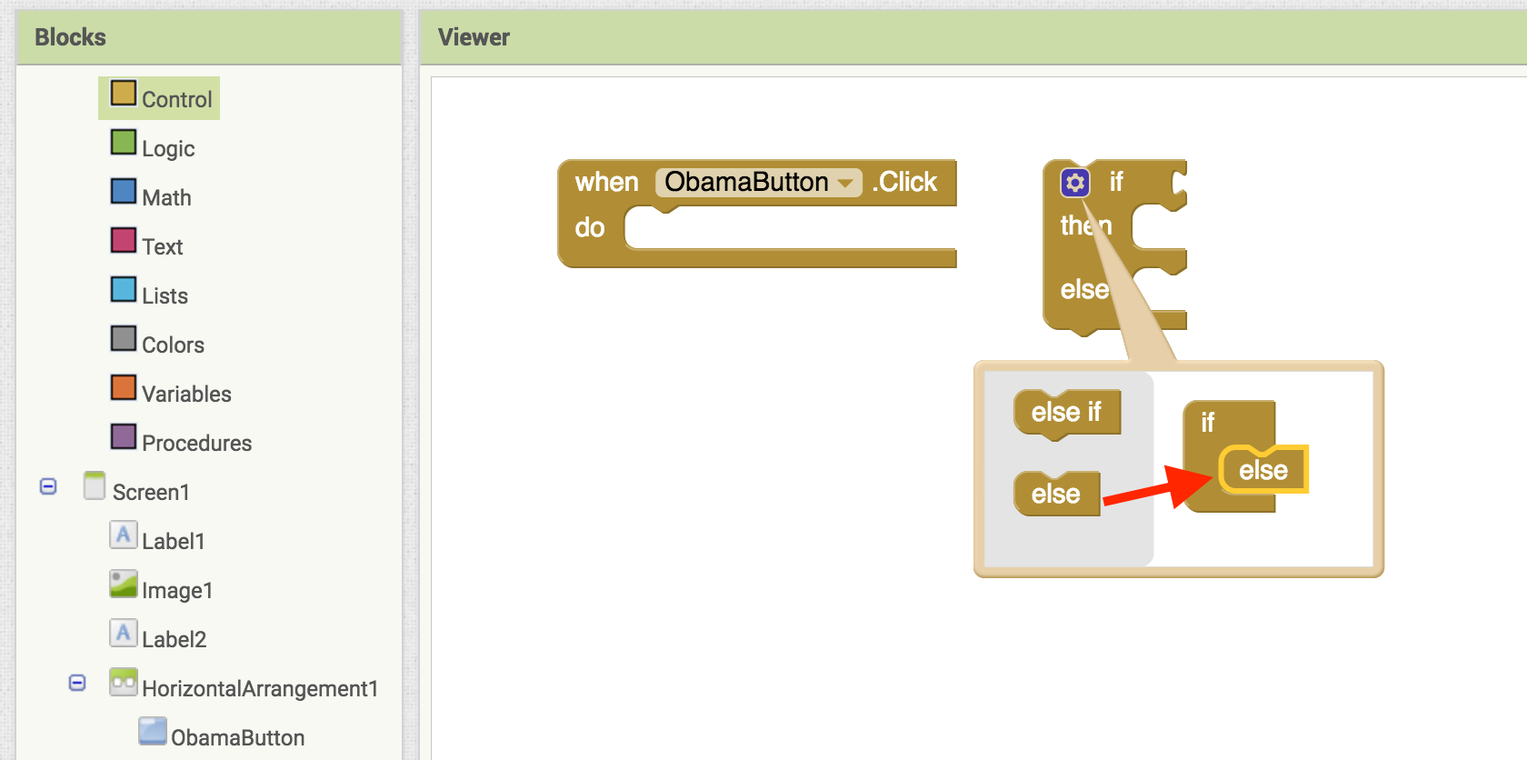 First, drag a when ObamaButton.Click block. Then, drag an if block from the Control drawer. Click the blue modifier icon, and drag an else block into the picture of the if block. This modifies your if block to have two branches.