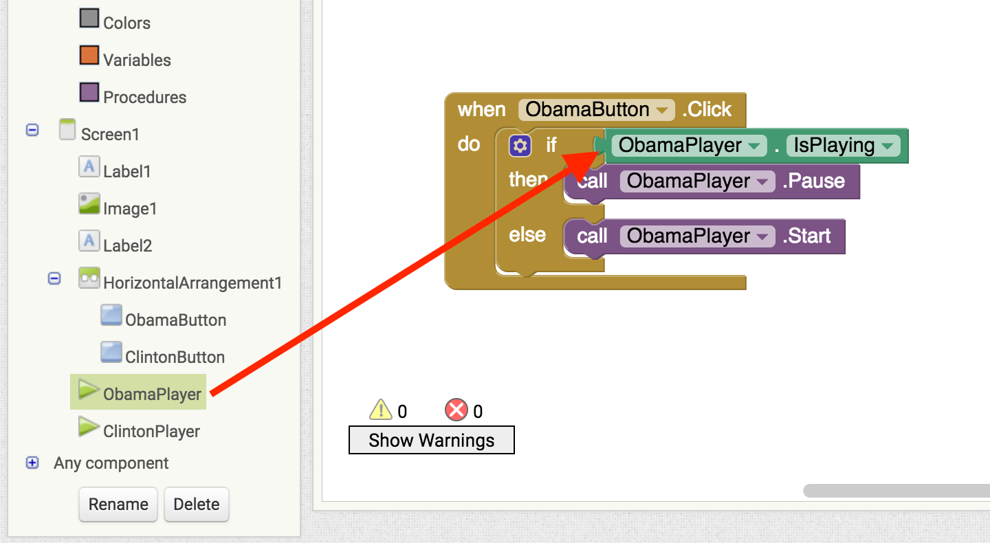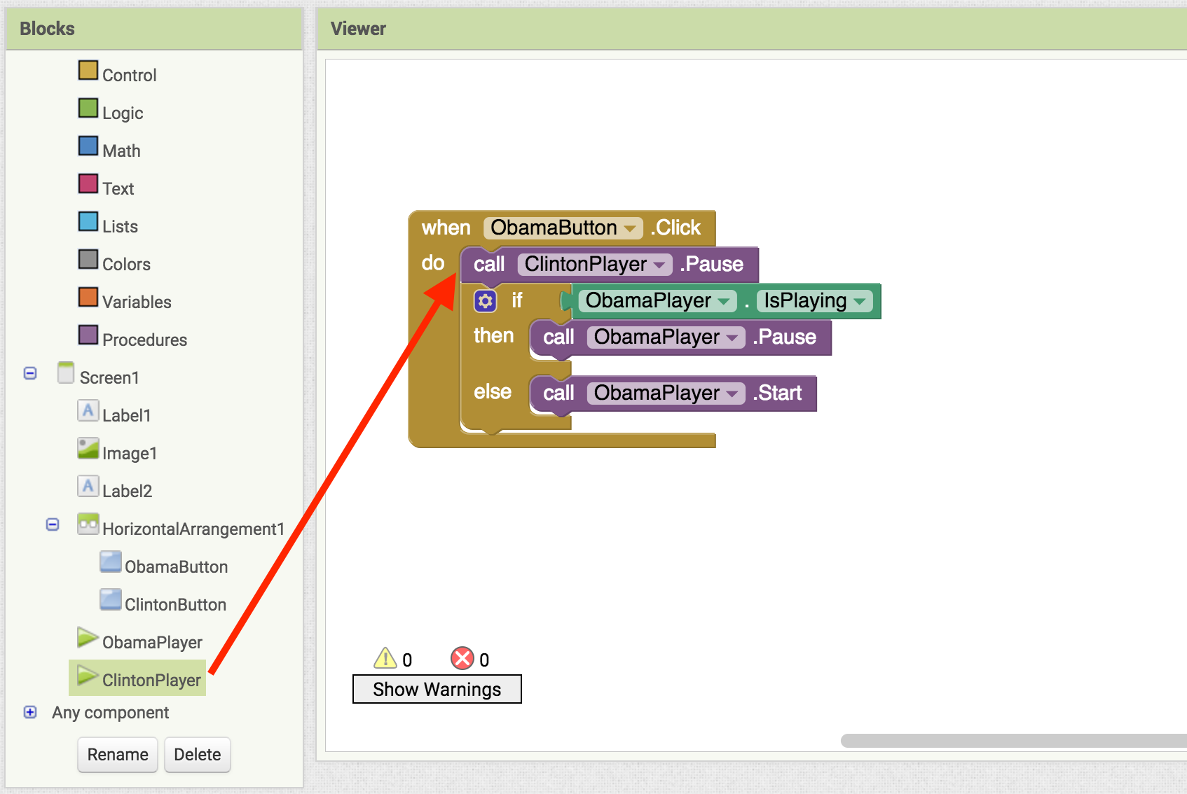 To do this, all we need to do is add a call ClintonPlayer.Pause block to the event handler as shown.
