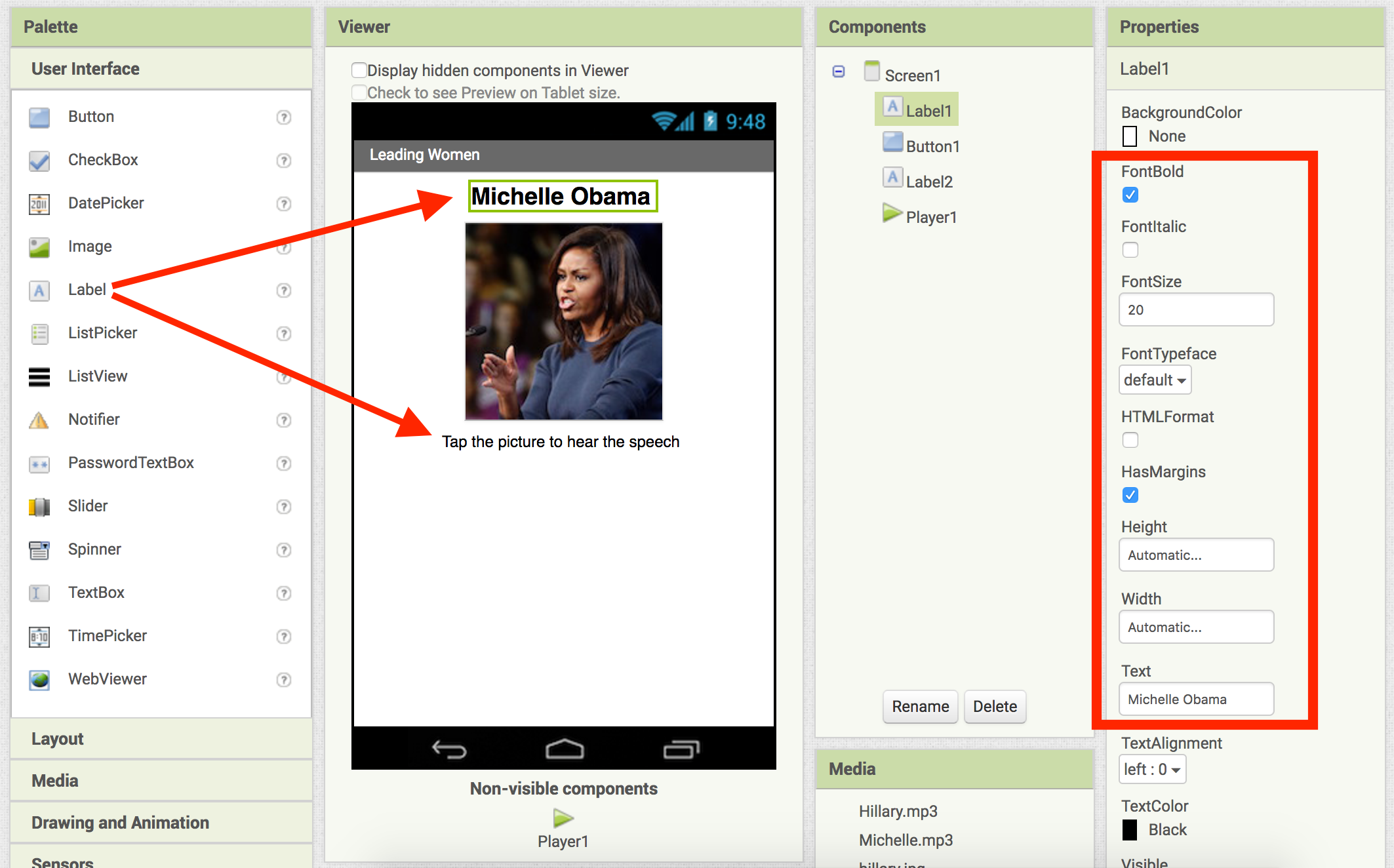 Set the source of the Player component to a sound clip of Obama's speech (use Michelle.mp3).